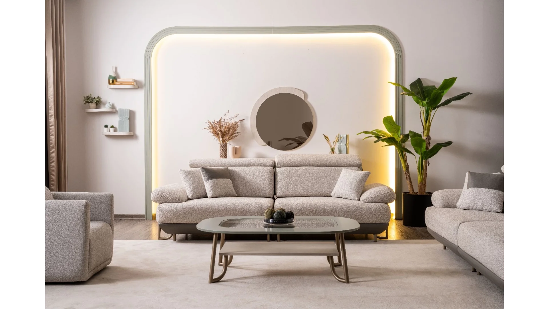 - 2 Adet 3'lü koltuk, 1 adet tekli koltuk ve sehpa ile bir bütün oluşturur.