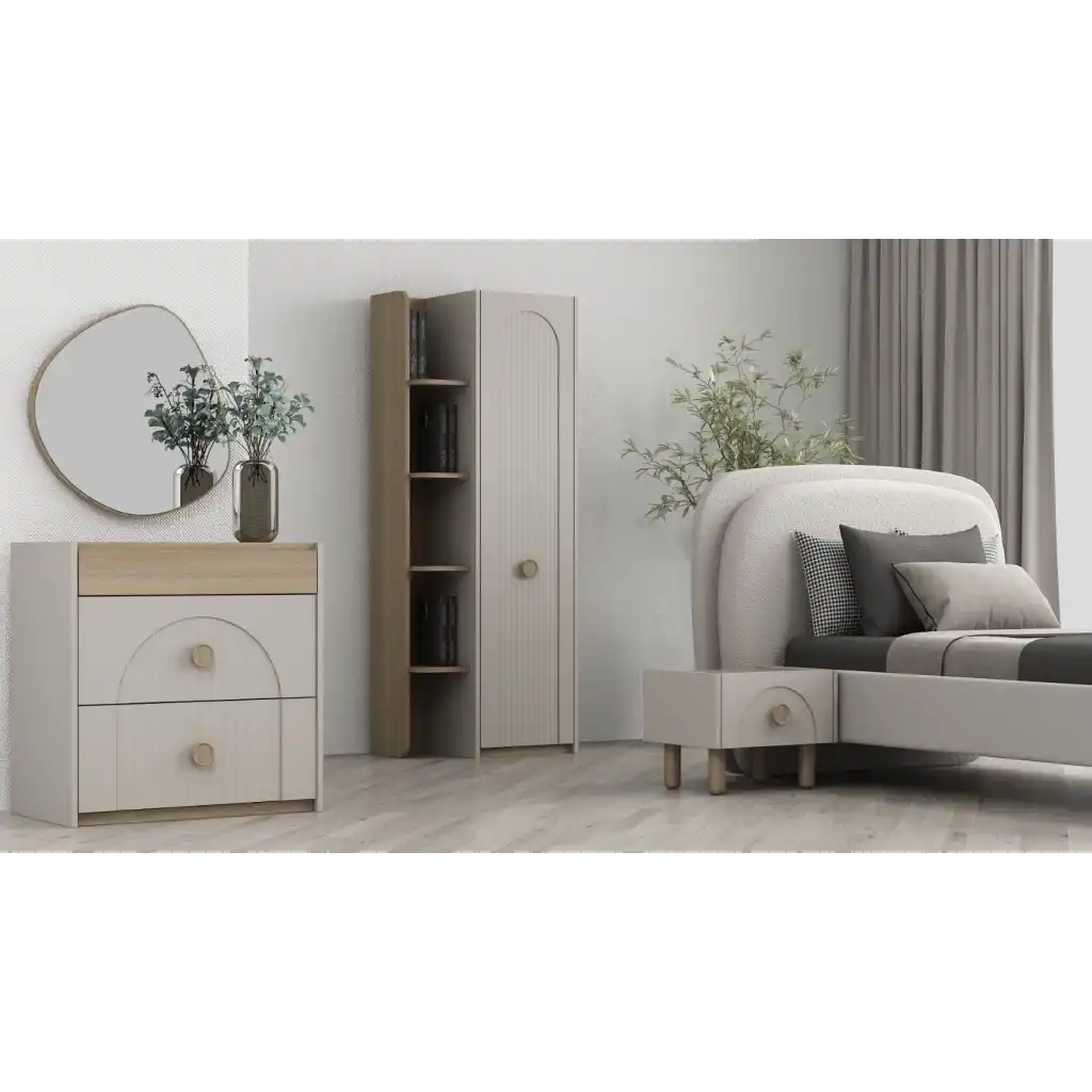 - Genç odası, karyola, şifonyer, komodin gibi parçalardan oluşan takım, gençlerin ihtiyaçlarına pratik çözümler sunar.