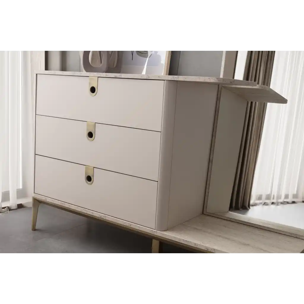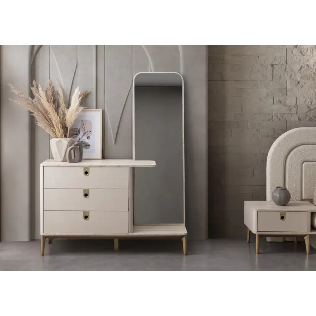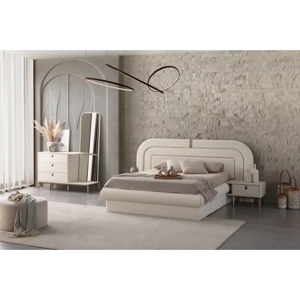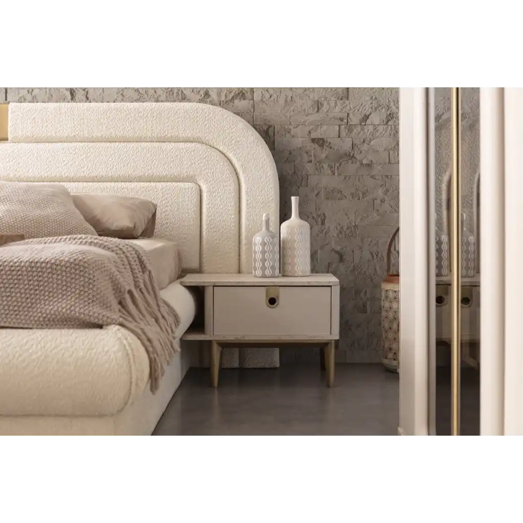 İnegöl Mobilya Cupra Yatak Odası Takımı, yatağı, başlık, şifonyer ve komodin gibi işlevsel parçalardan oluşur.