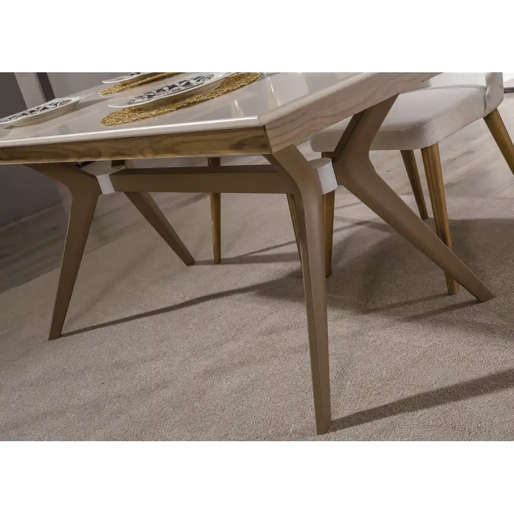 Özel tasarımı ve dayanıklı malzemeleri ile uzun yıllar kullanabileceğiniz bu yemek odası takımı, modern ve zarif bir görünüme sahiptir.