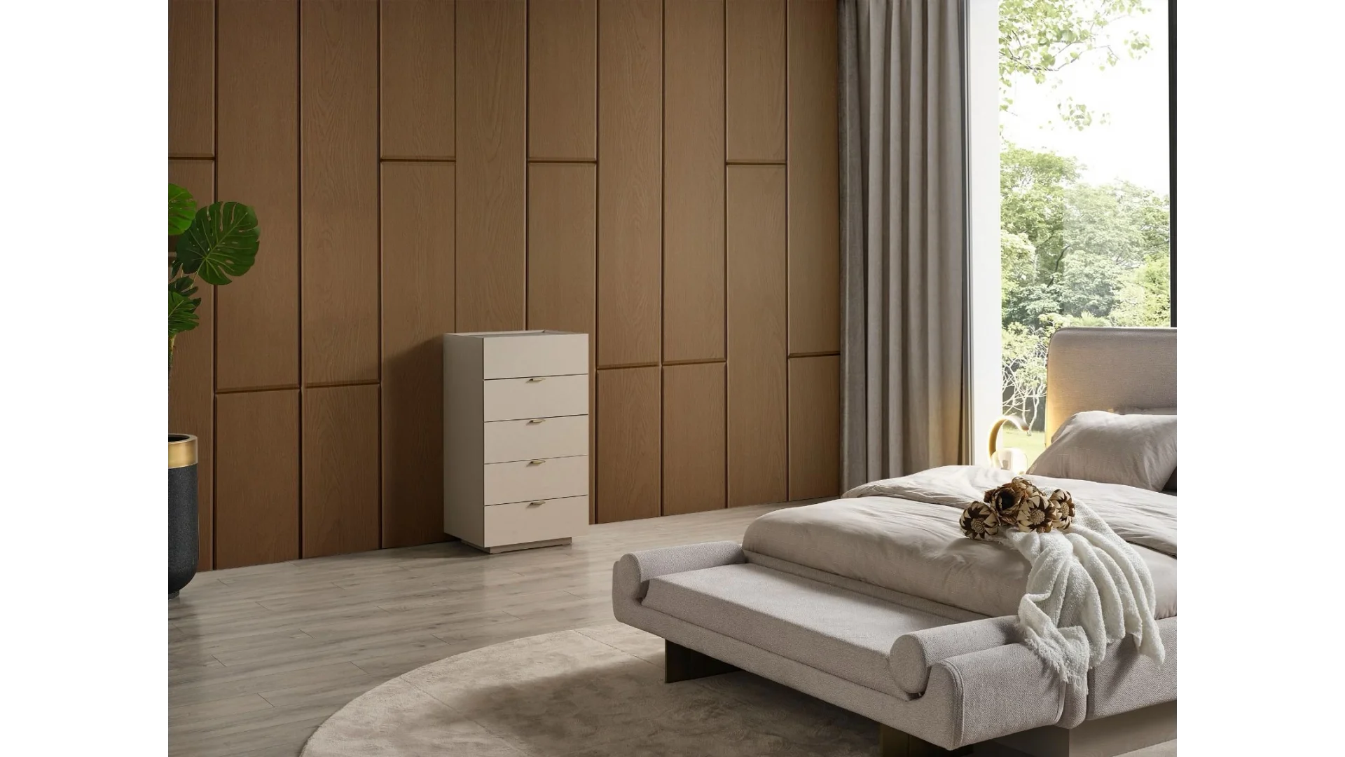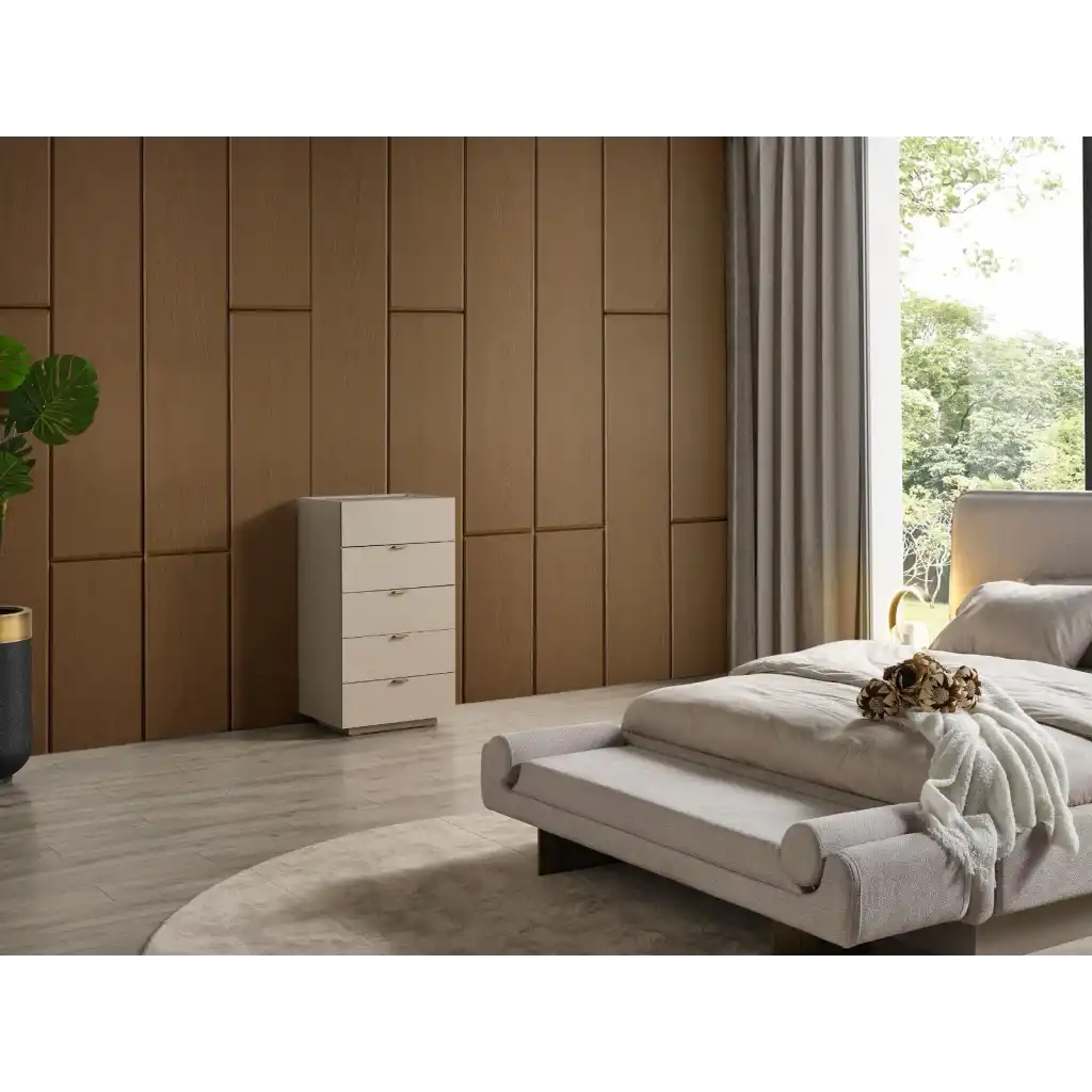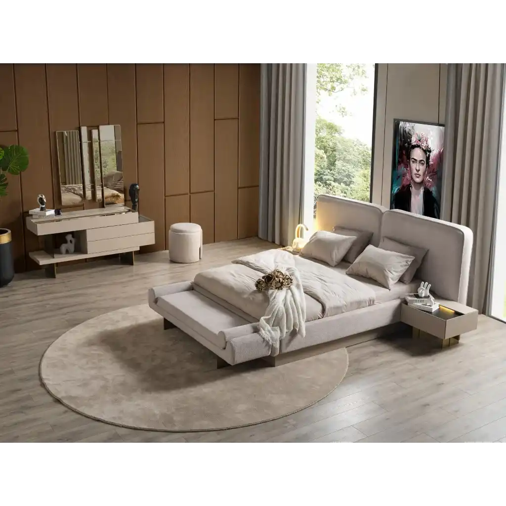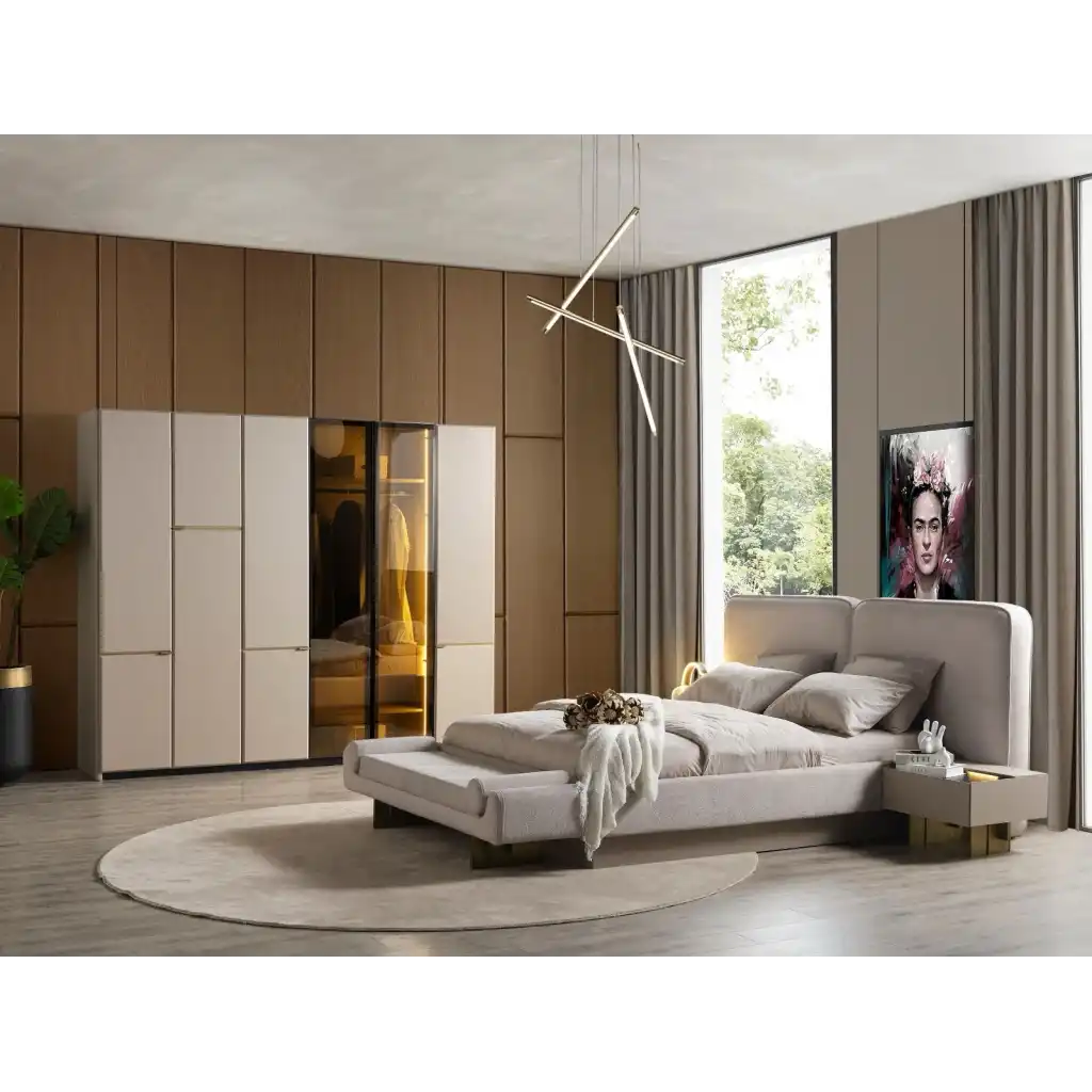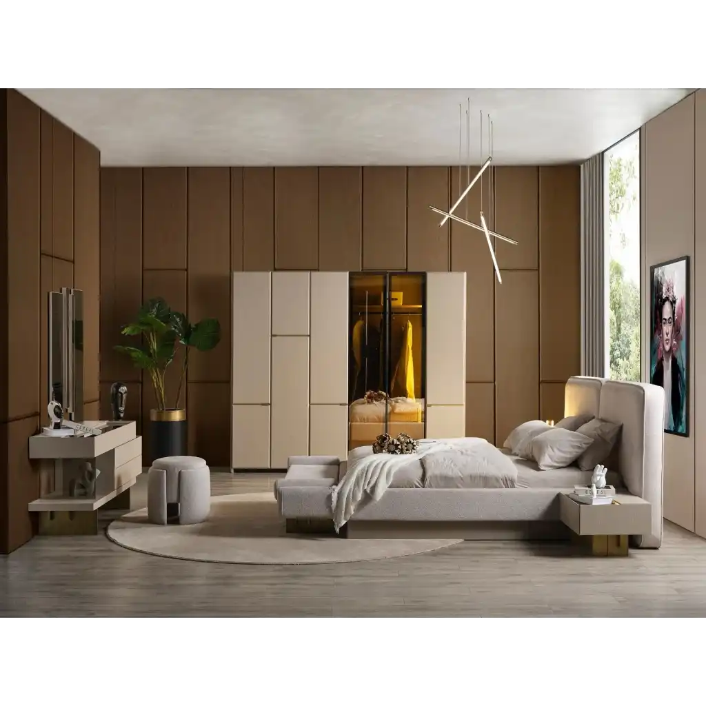 Modern tasarımı ve kaliteli malzemesiyle dikkat çeken bu yatak odası takımı, yatak odanızı adeta bir cennete çevirecek.
