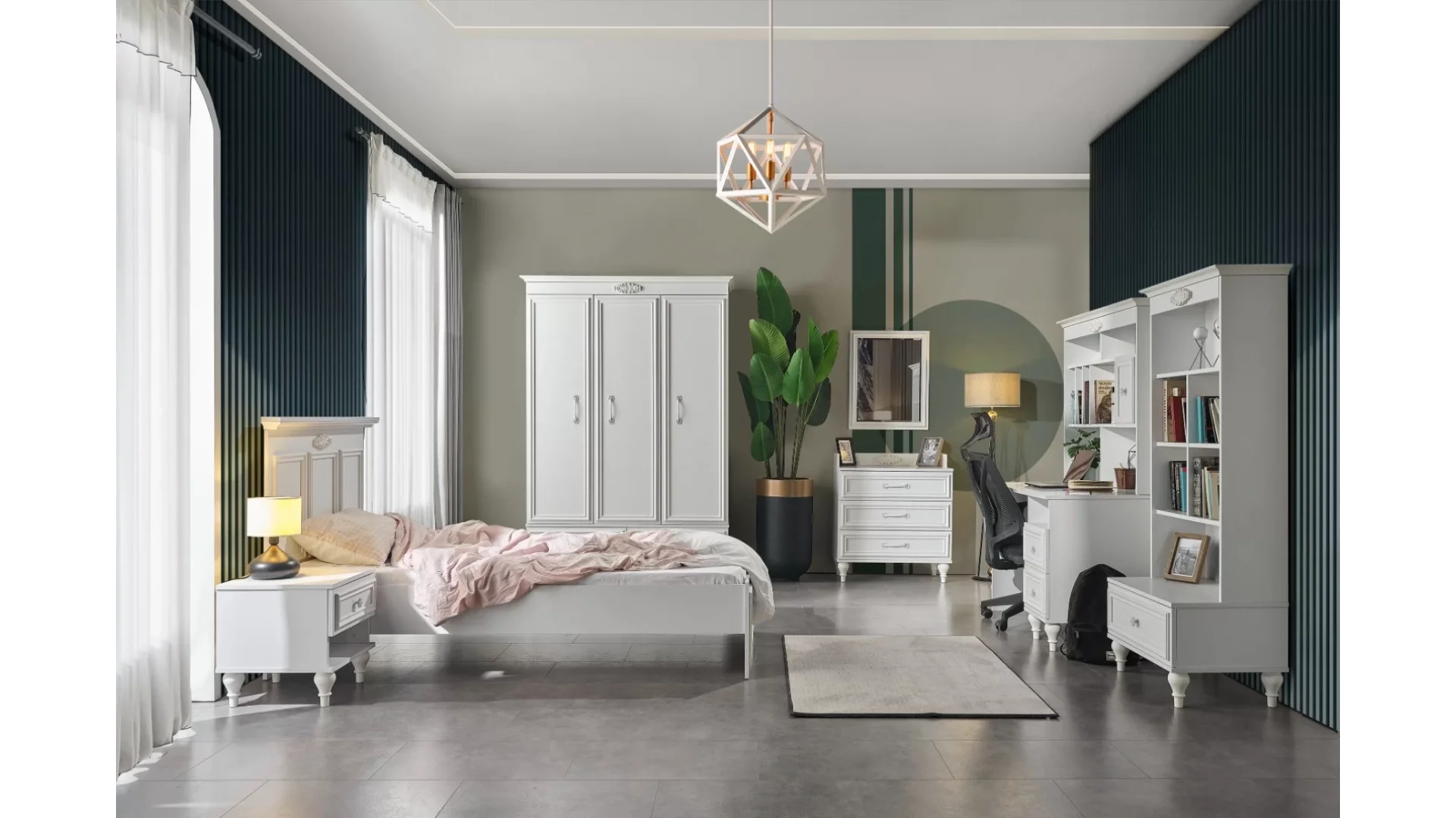 Occo Home markasının İskenderiye Beyaz Genç Odası, gençlerin ihtiyaçlarına ve zevklerine hitap eden şık ve fonksiyonel bir seçenektir.
