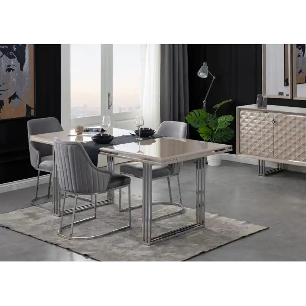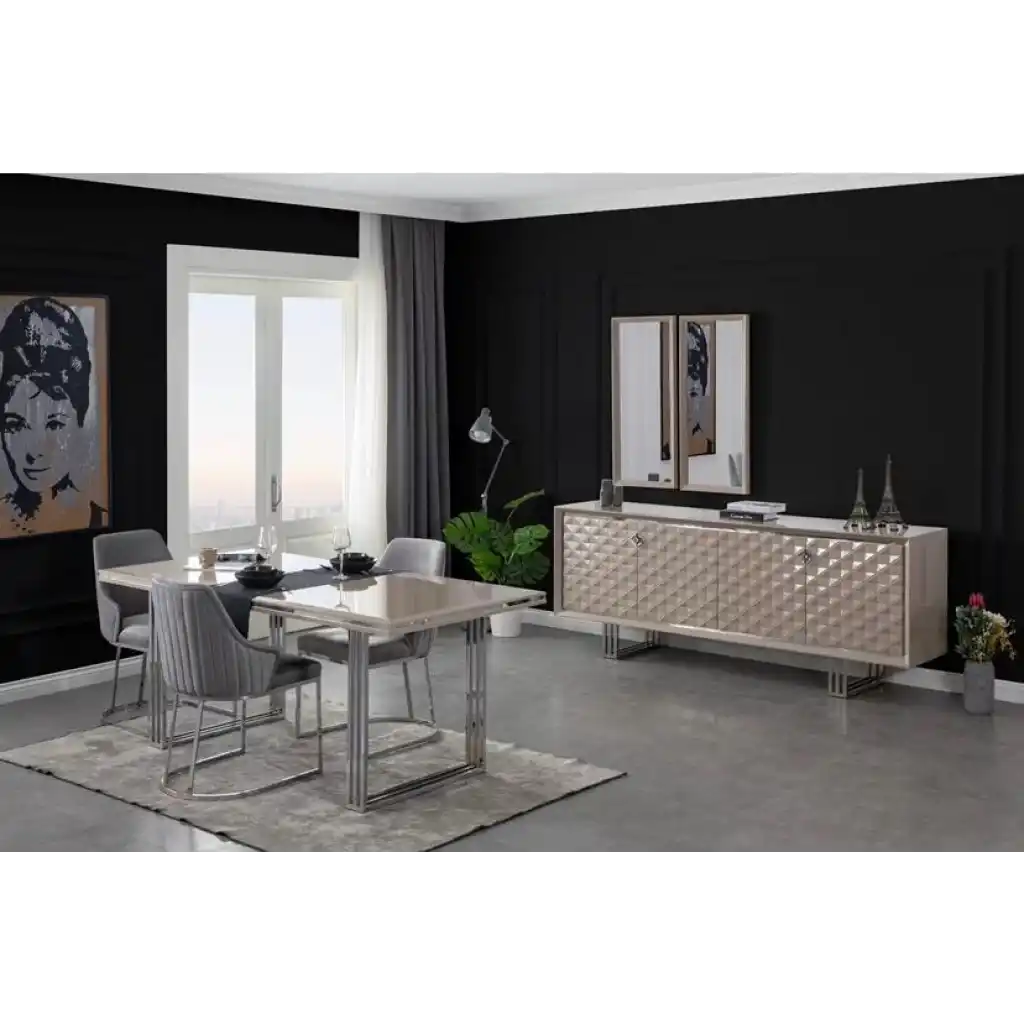 Yüksek kaliteli malzeme kullanılarak üretilmiş olan bu yemek odası takımı, modern ve şık tasarımıyla dikkat çekiyor.