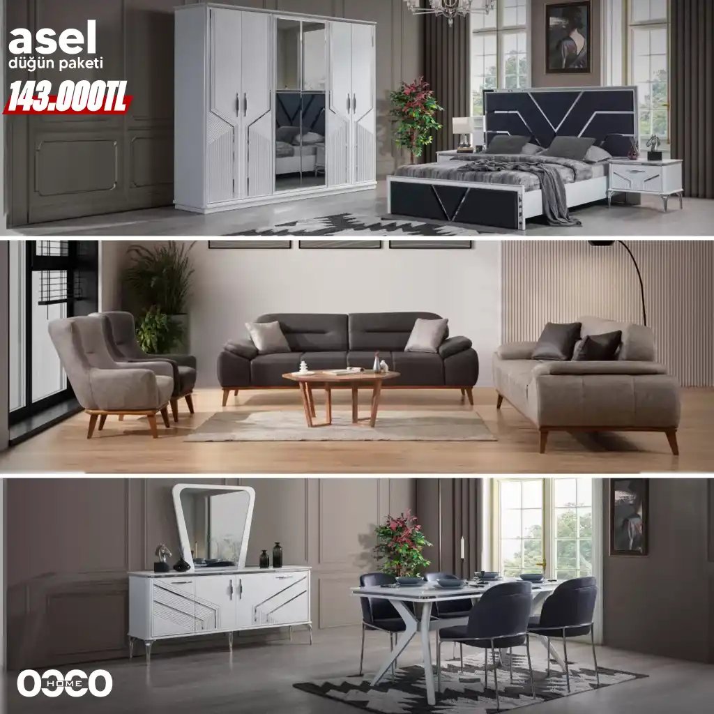 İnegöl Mobilya Asel Düğün Paketi, Occo Home kalitesiyle şıklığı ve işlevselliği bir araya getiriyor. Bu eşsiz düğün paketi, özel tasarımı ve kaliteli malzemeleriyle beğeni topluyor.