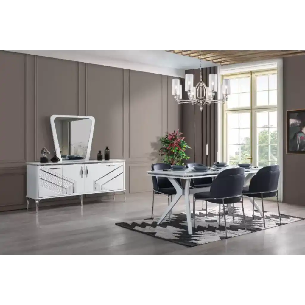 | Yemek Odası | 1 Adet Konsol ve Aynası, 1 Adet Yemek Masası, 6 Adet Sandalye'den Oluşmaktadır. |