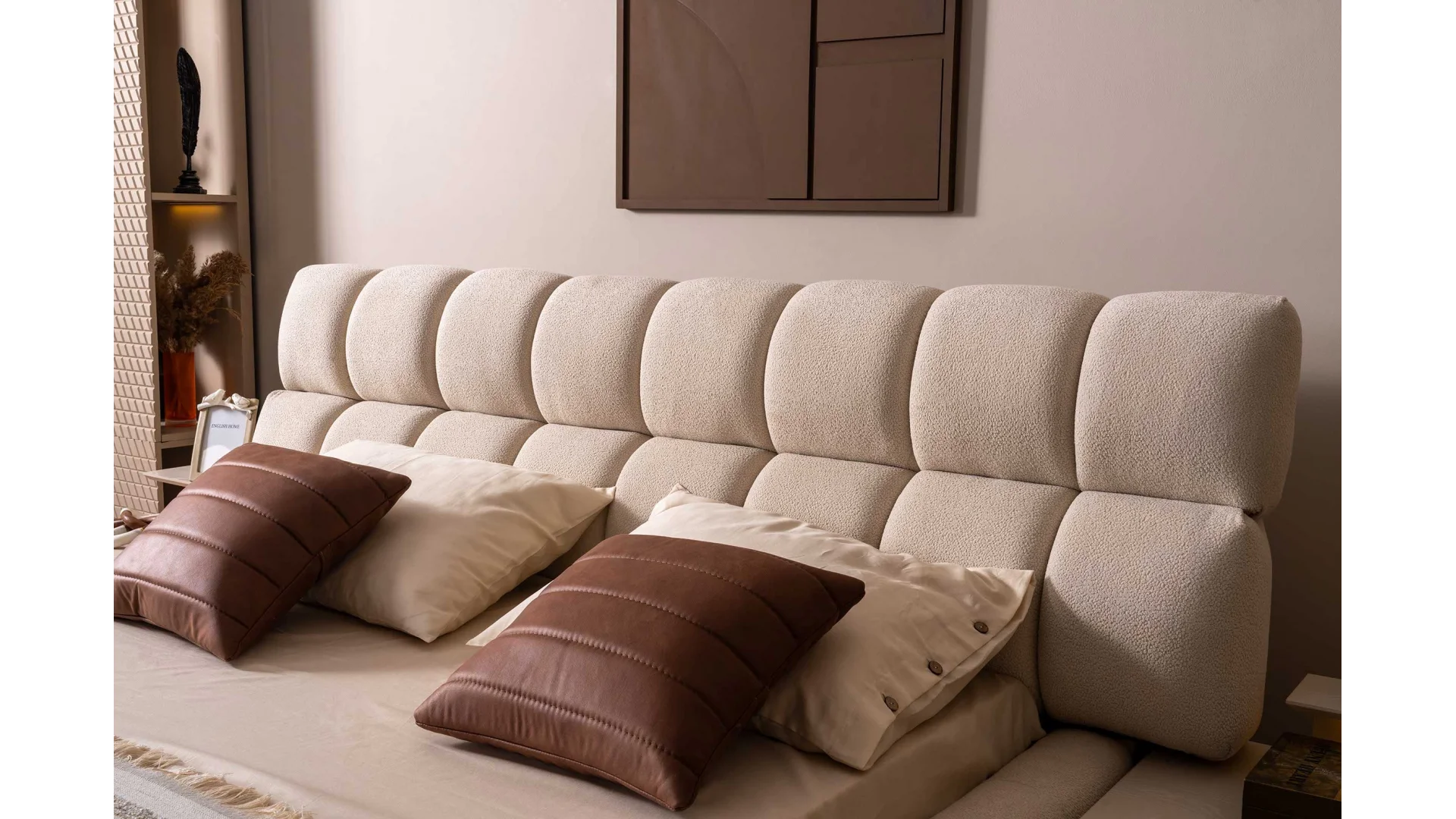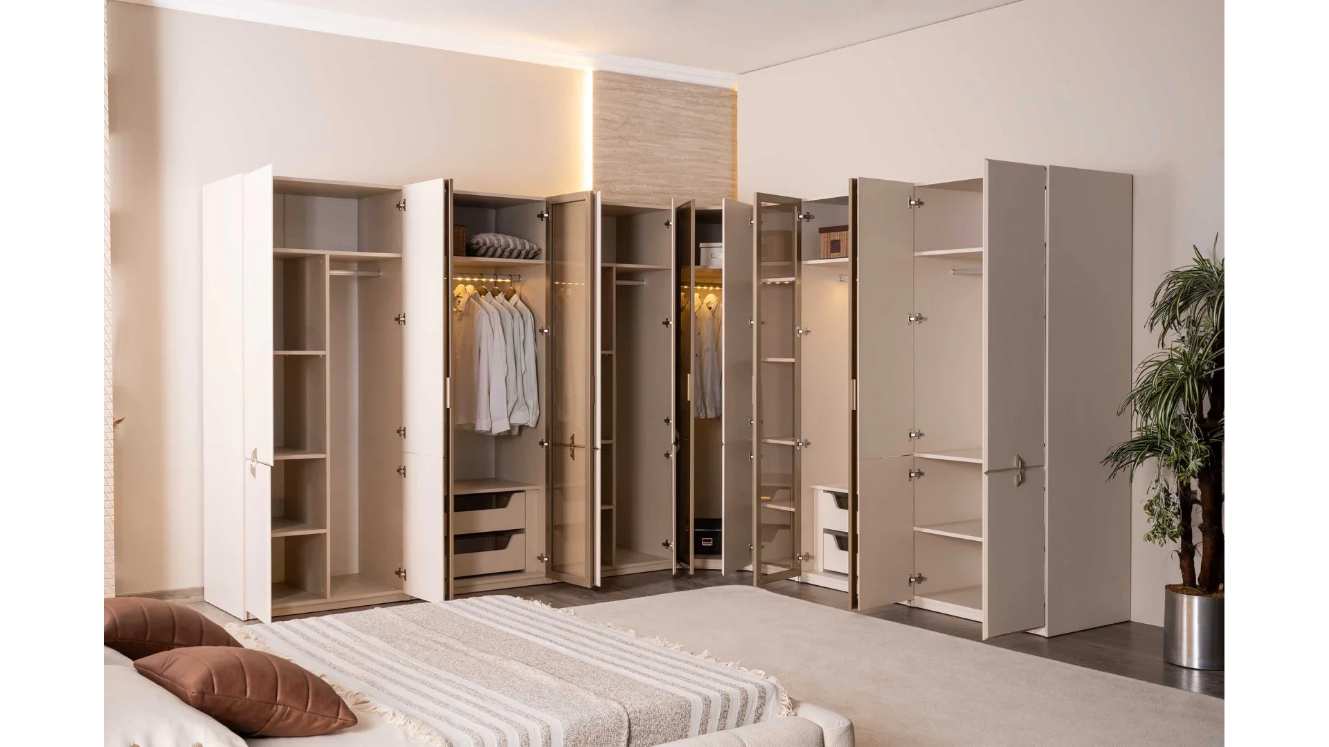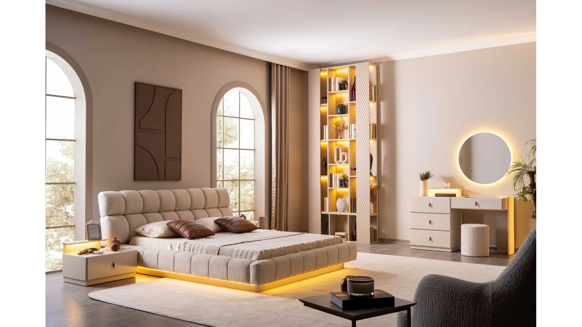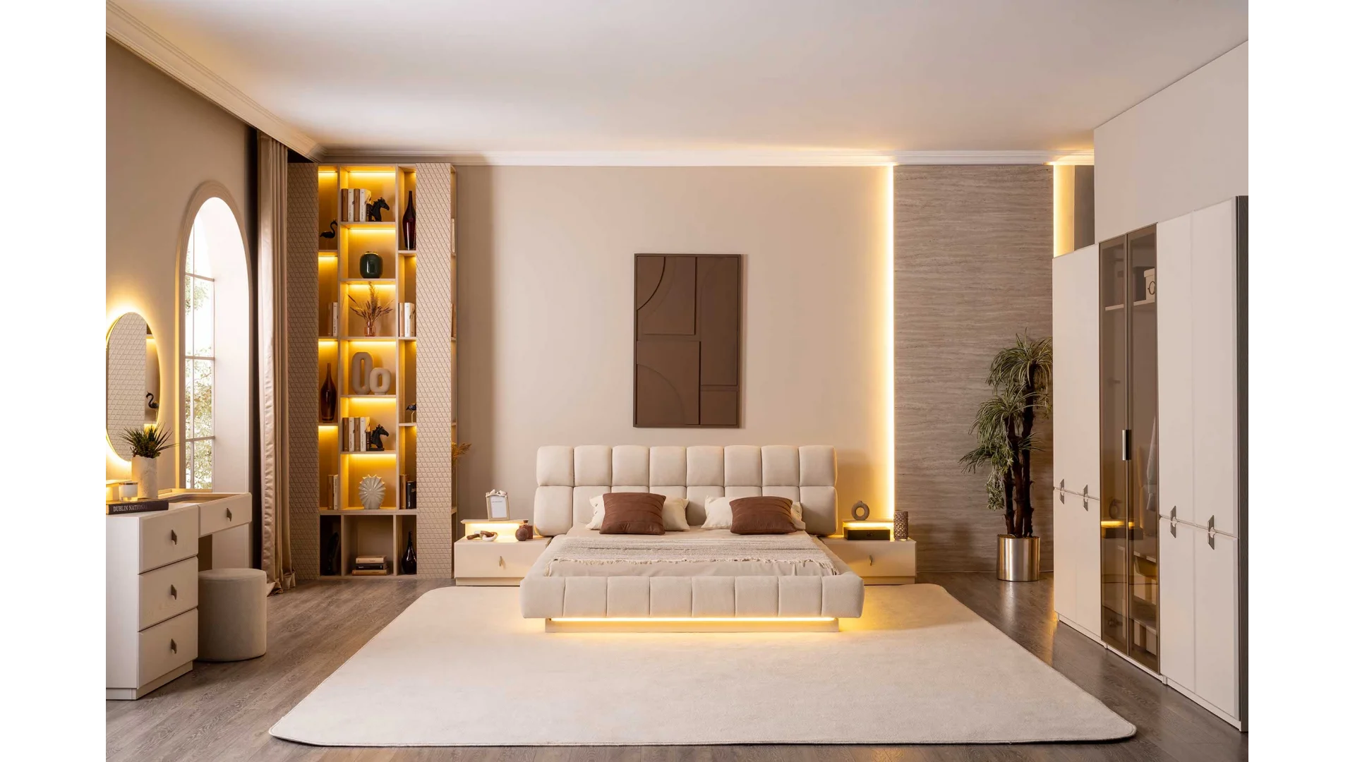 - Yatak başlığı, komodin, gardırop ve şifonyer gibi parçalarla tam bir yatak odası takımı