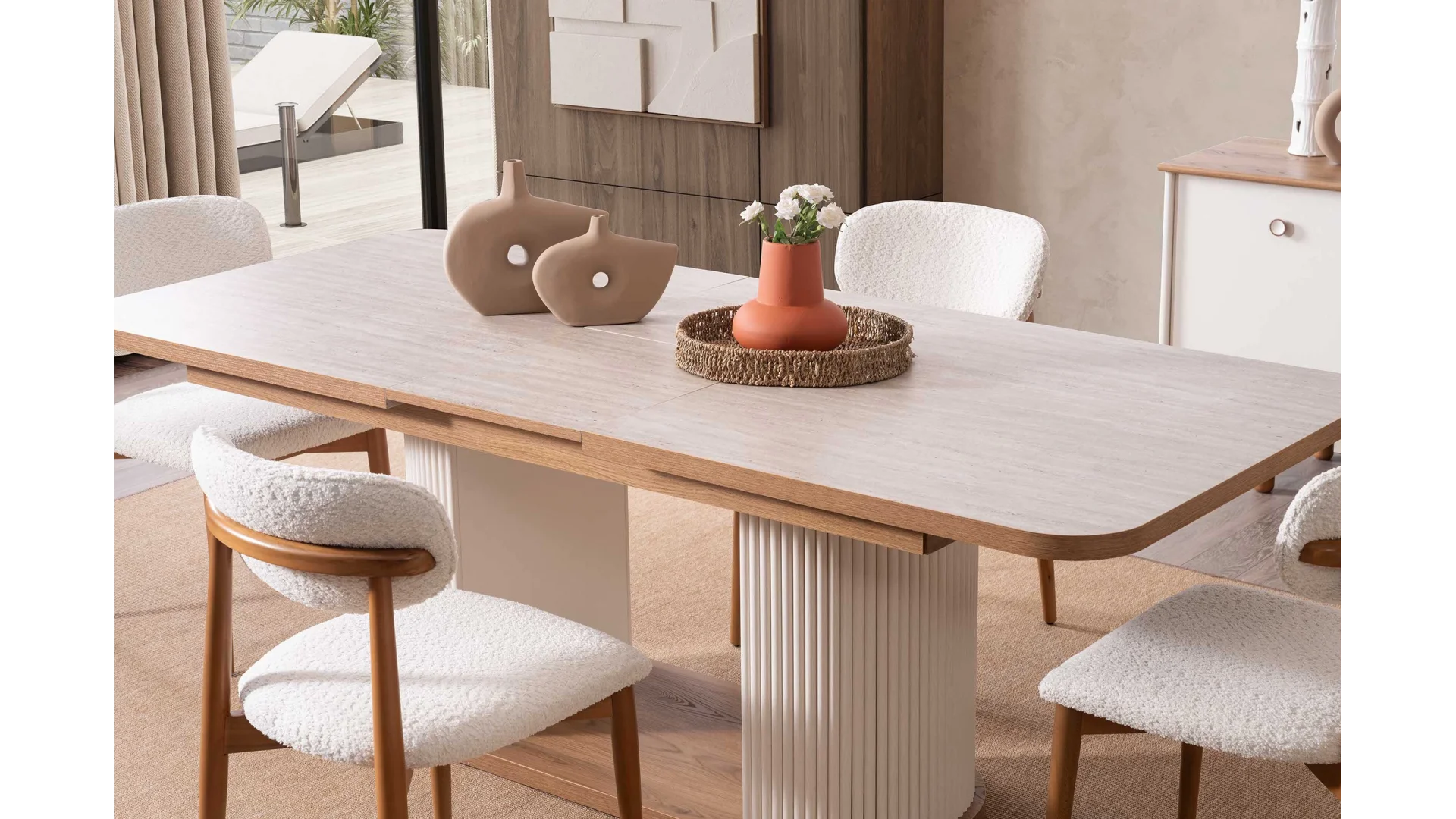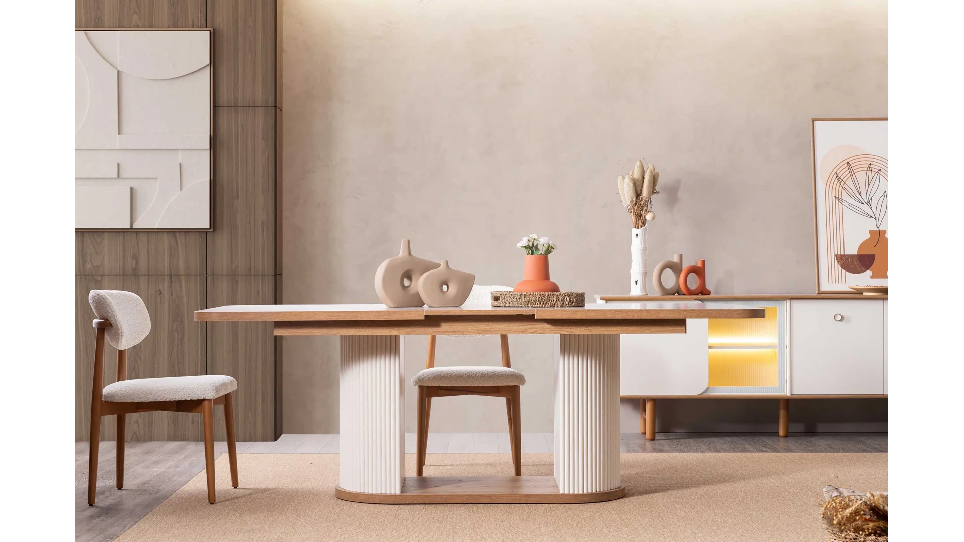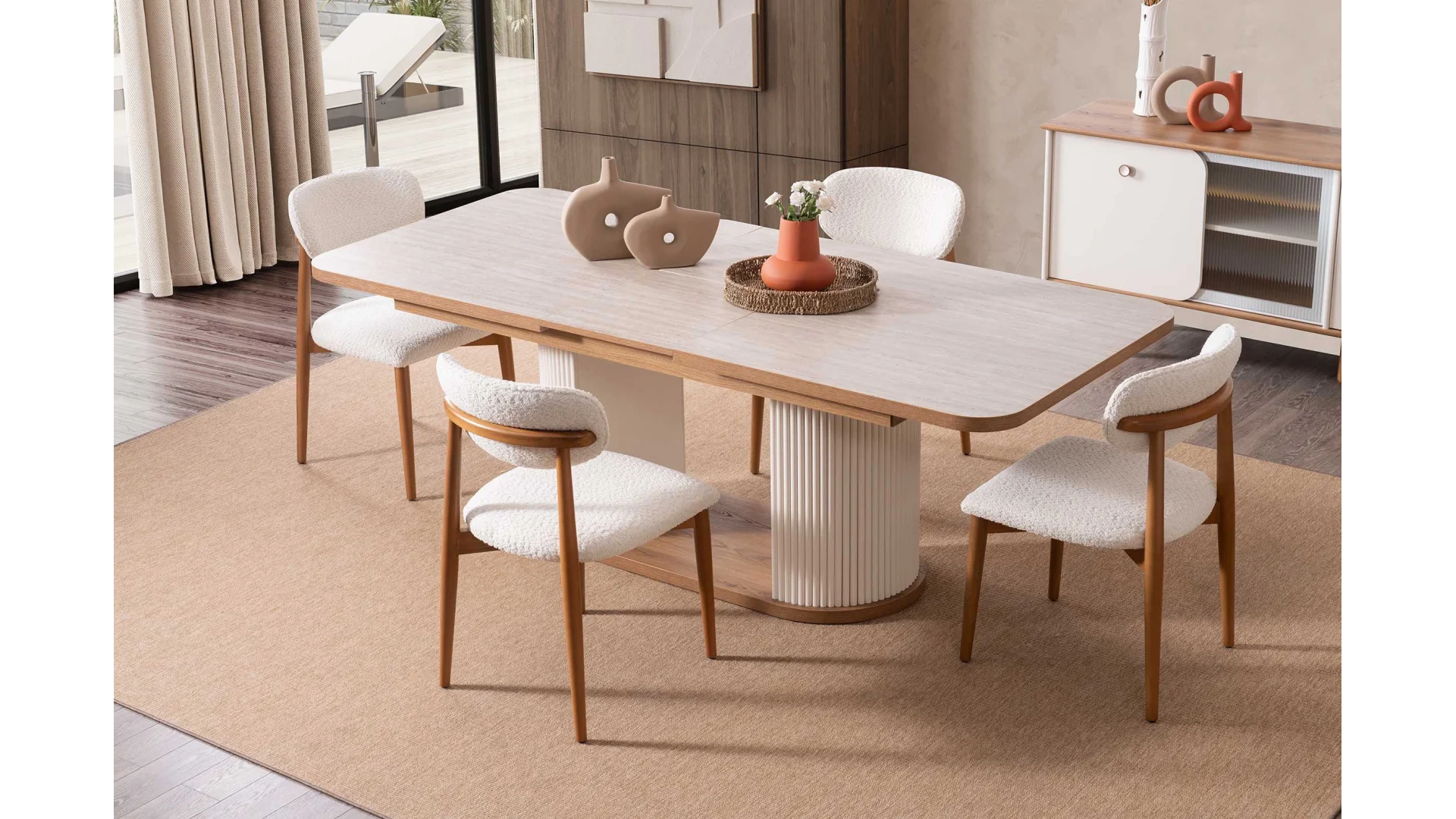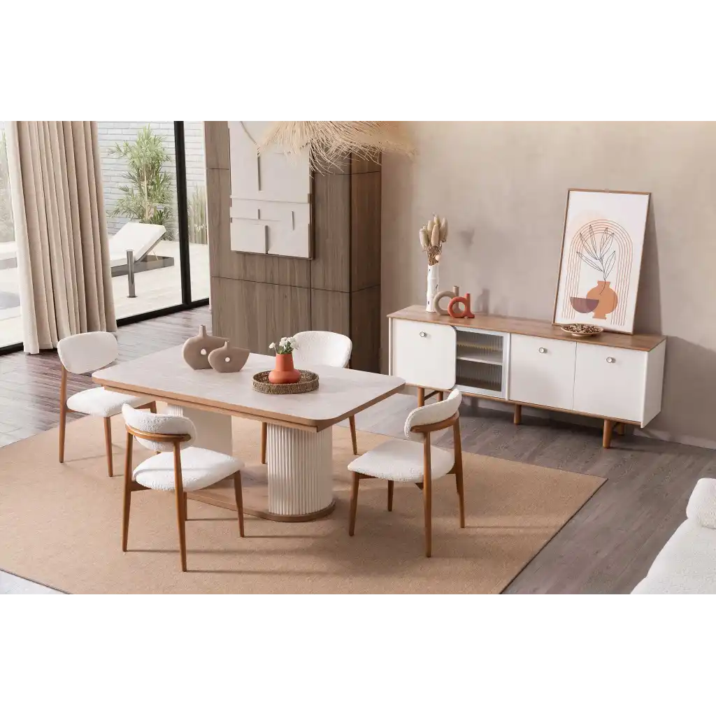 Yemek odası takımı içerisinde; geniş bir yemek masası, konforlu sandalyeler ve şık bir Konsol bulunmaktadır.