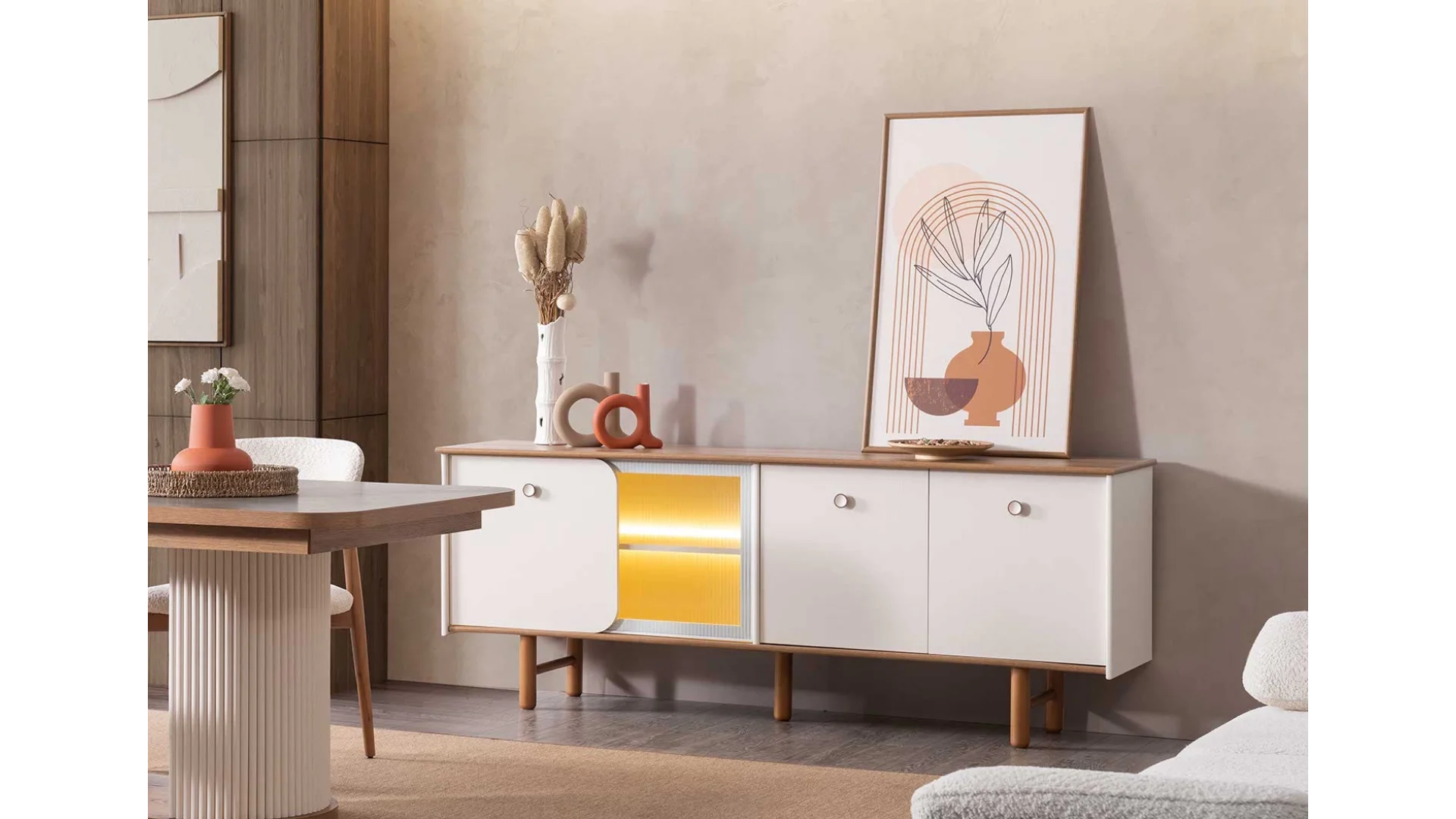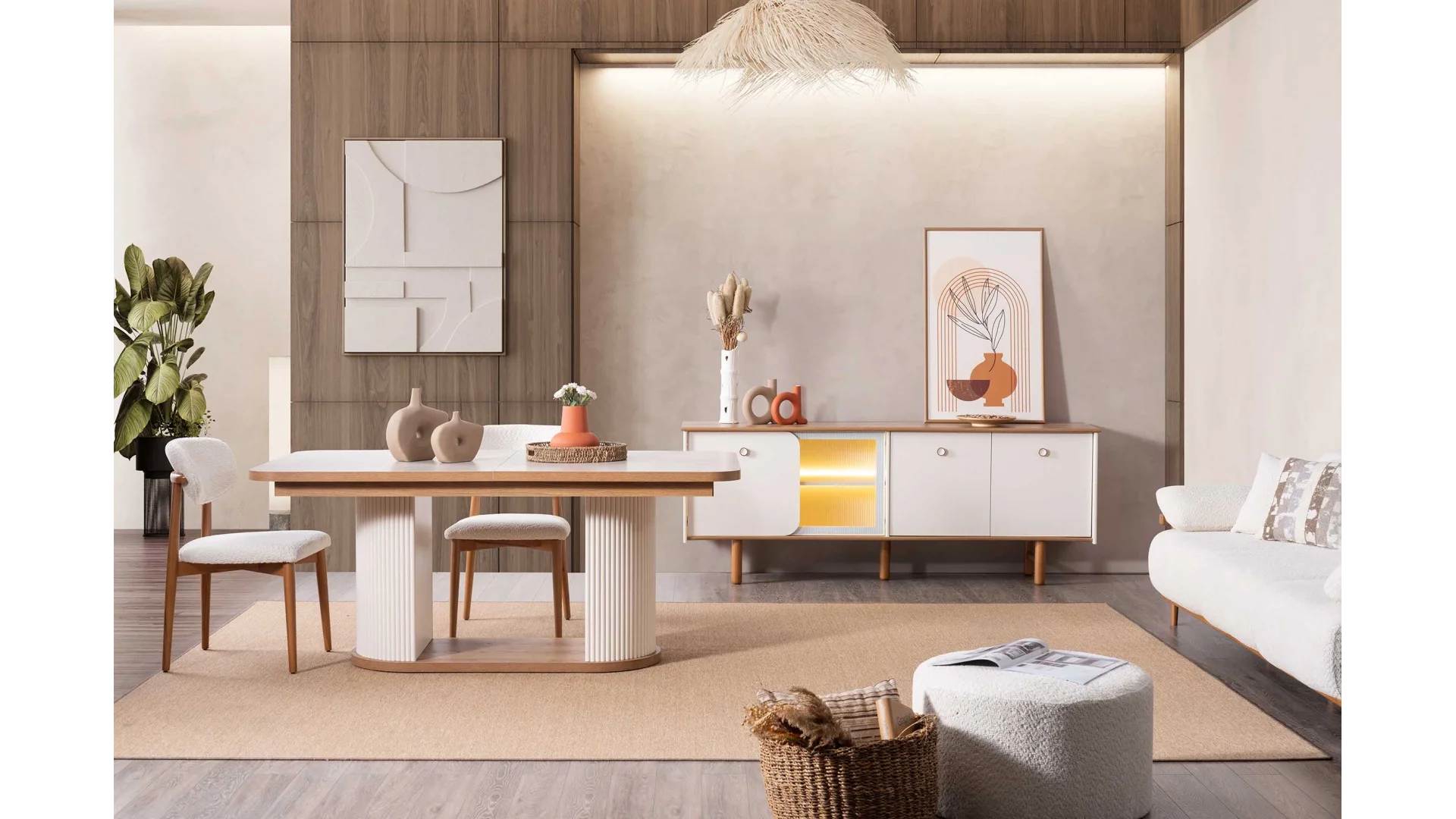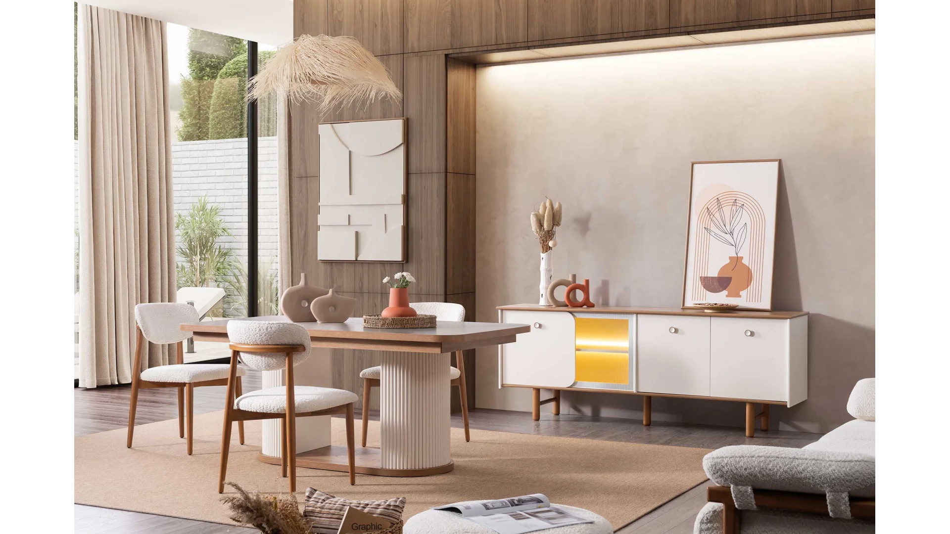 Yemek odası takımı içerisinde; geniş bir yemek masası, konforlu sandalyeler ve şık bir Konsol bulunmaktadır.