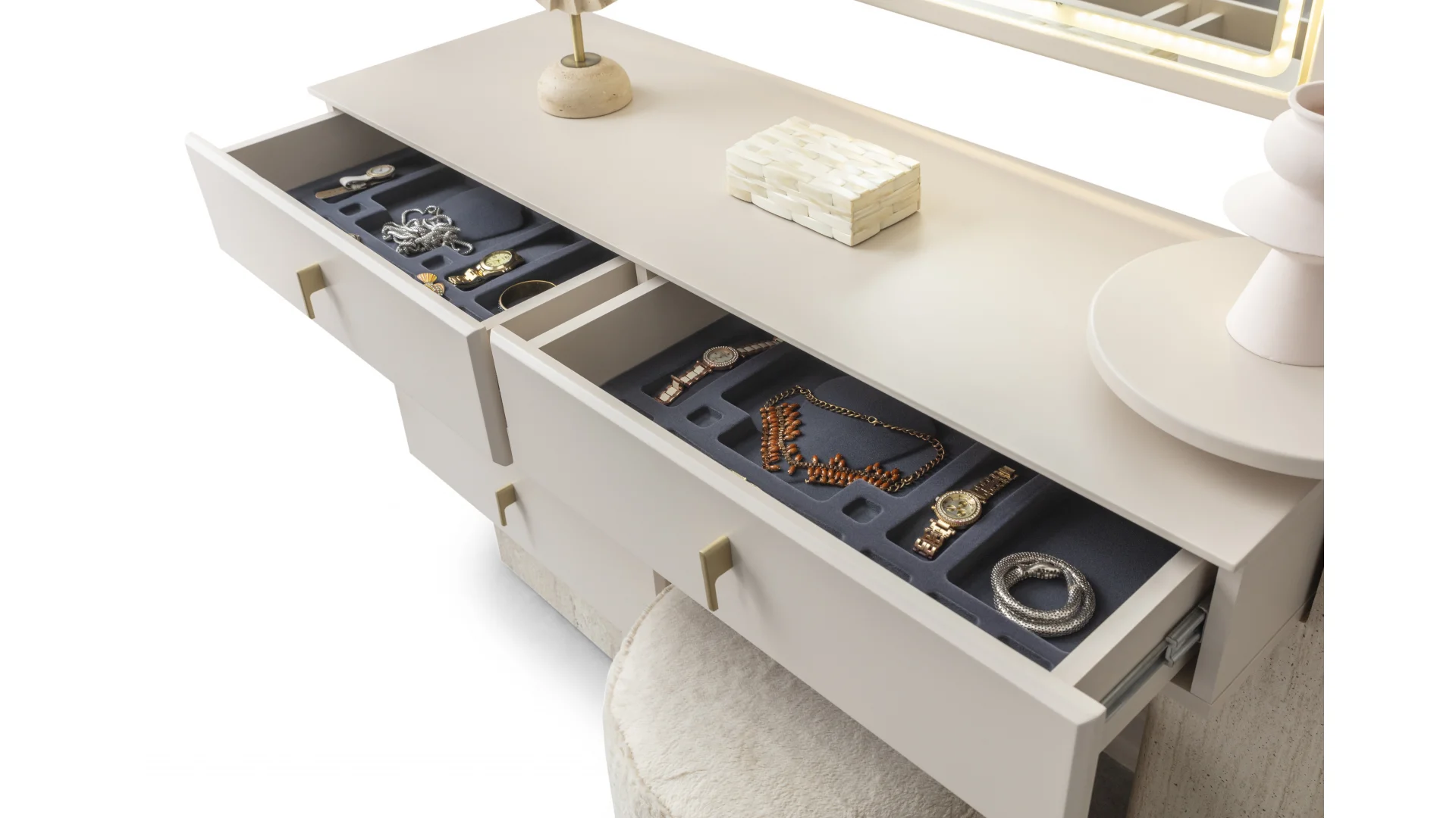 | Şifonyer | Gövde, Yonga Levha ile üretilmiştir. Ön yüzler, MDF malzeme üzeri lake boya ile üretilmiştir. |