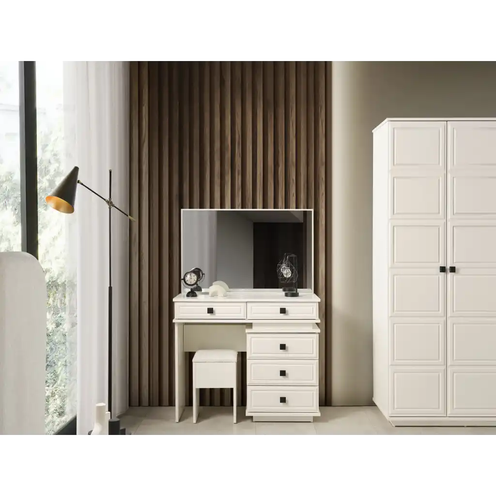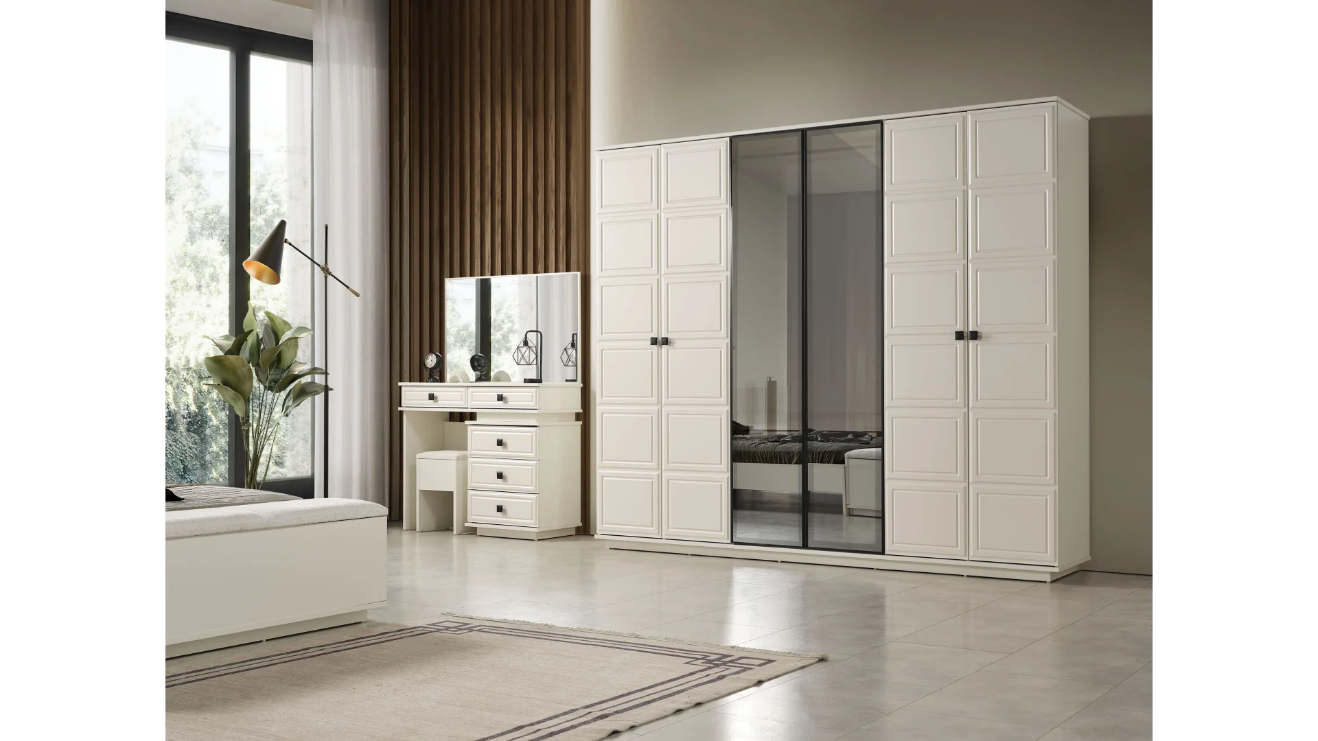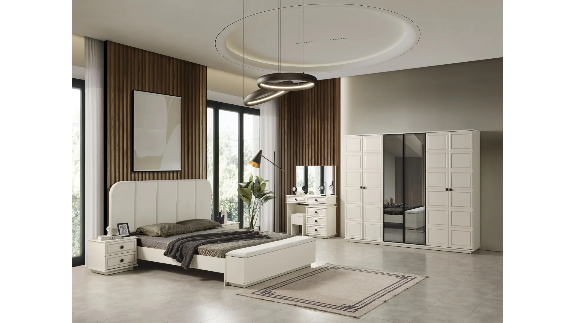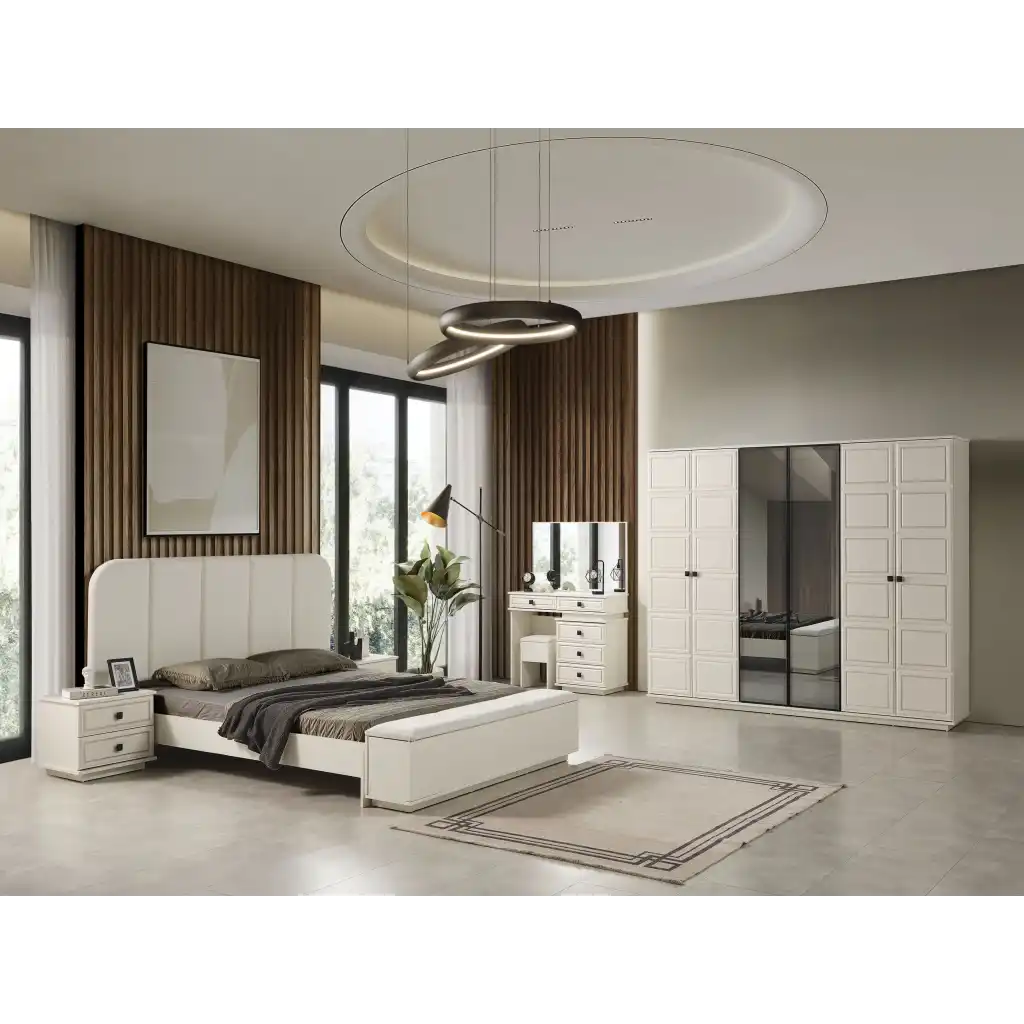 Yatak başlığı, şifonyer, gardırop, komodin ve aynadan oluşan bu takım ile yatak odanızı istediğiniz şekilde düzenleyebilirsiniz.