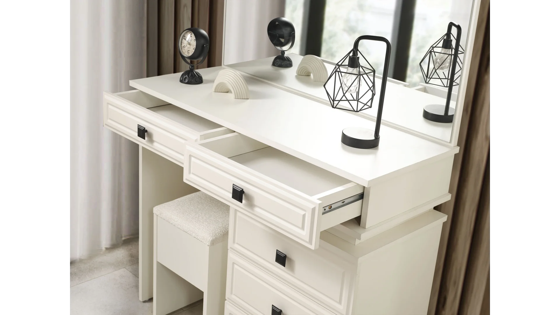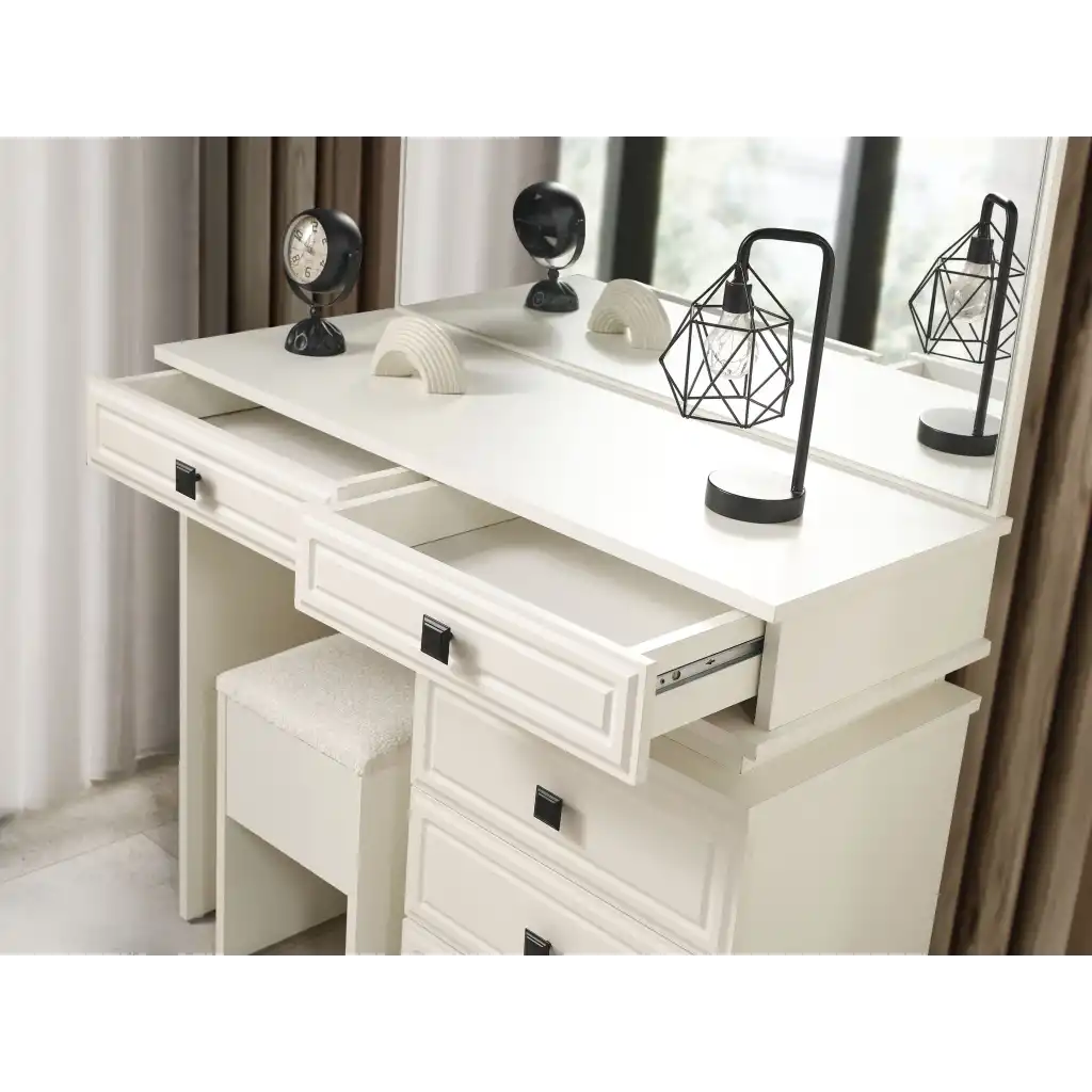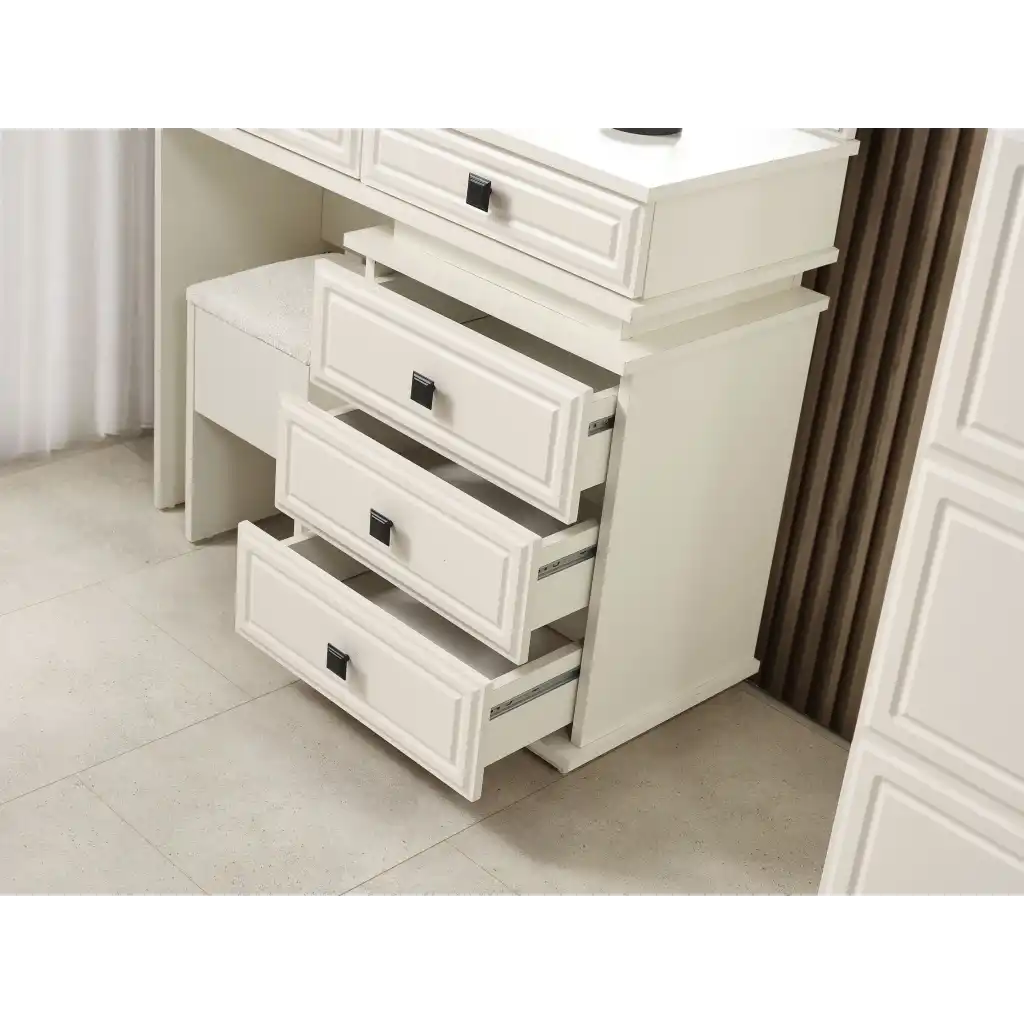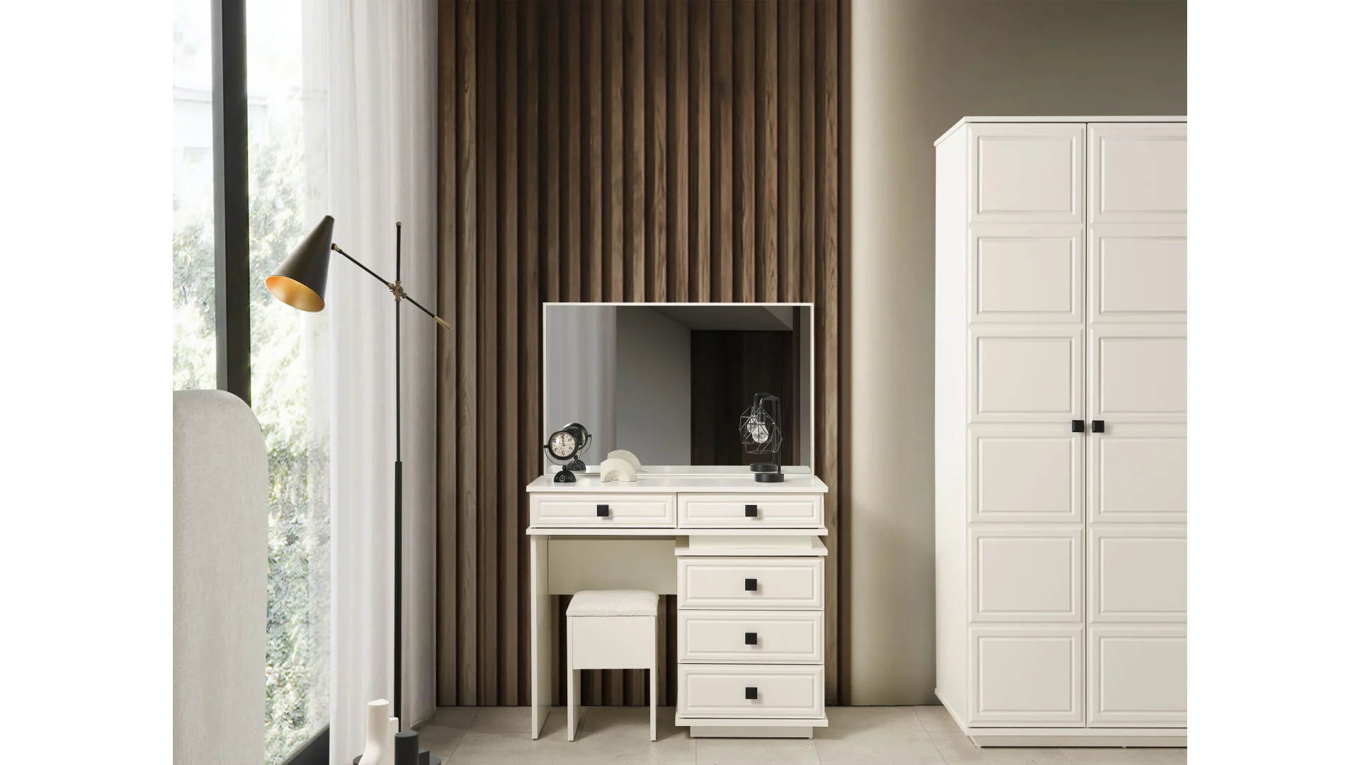 Yatak başlığı, şifonyer, gardırop, komodin ve aynadan oluşan bu takım ile yatak odanızı istediğiniz şekilde düzenleyebilirsiniz.